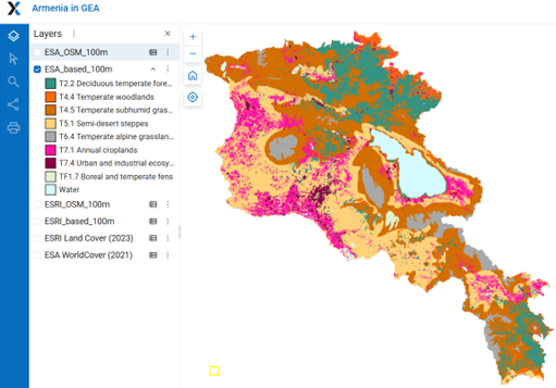 Since Armenia currently lacks a national regularly updated land cover dataset, we tested five land cover datasets available in open access. Three of them — ESRI, ESA, and GLAD datasets — most accurately reflect the current land cover of Armenia and can be used for the zero version of the Armenia ecosystem map for the GEA.