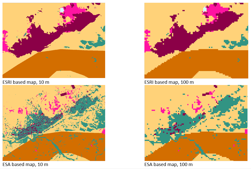 Due to differences in the methodologies used by ESRI and ESA to identify built-up areas, croplands, and tree cover, the resulting maps show noticeable differences in the areas of these classes. The more detailed ESA land-cover dataset identifies grasslands, croplands, and tree cover within settlement areas; therefore, in the raster based on ESA data, built-up area is smaller than in the raster based on ESRI data and some settlements with a high density of trees (small private gardens, street trees, and parks) are identified in the ESA data predominantly as tree cover (Fig. 2.7B-3).