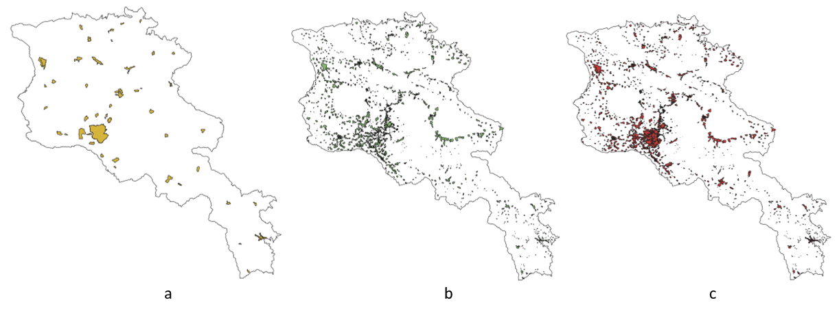 Figure 2.7B-4. Used OSM layers: (a) administrative boundaries of towns and the city of Yerevan; (b) built-up area polygons; (c) combined layer.