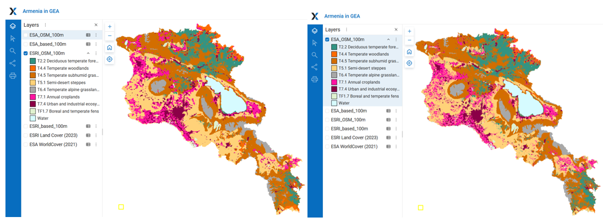Figure 2.7B-2. Maps of current terrestrial ecosystems of Armenia based on ESRI 2023 and ESA 2021 land cover data. For detailed maps see project Web GIS, section Armenia in GEA