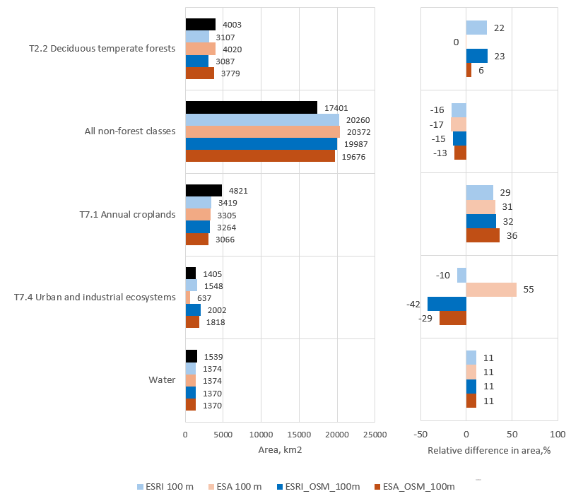 To compare the created ecosystem maps with land-cover class area data provided by the Government of Armenia (TR Section 2.2A), all non-forest ecosystem classes in our maps were aggregated into a single class. We used government-reported data for 2022 (https://www.arlis.am/hy/acts/171671). All versions of created maps show cropland areas that are smaller than those reported in the official government statistics, while the area of non-forest ecosystems is larger. This indicates that part of croplands included in government statistics is identified as grassland by the land-cover datasets. Built-up area in maps created for the GEA exceeds the values reported in government statistics, except for the map version based on ESA data, where the built-up area is substantially smaller. With respect to forest area, the map versions based on ESA data show better agreement with the government statistics (Figure 2.7C-1). The sum of the absolute differences between class areas in the cerated maps and the government statistics is smallest for the map based on ESA and OSM data – ESA_OSM_100m.tif (Figure 2.7C-2).