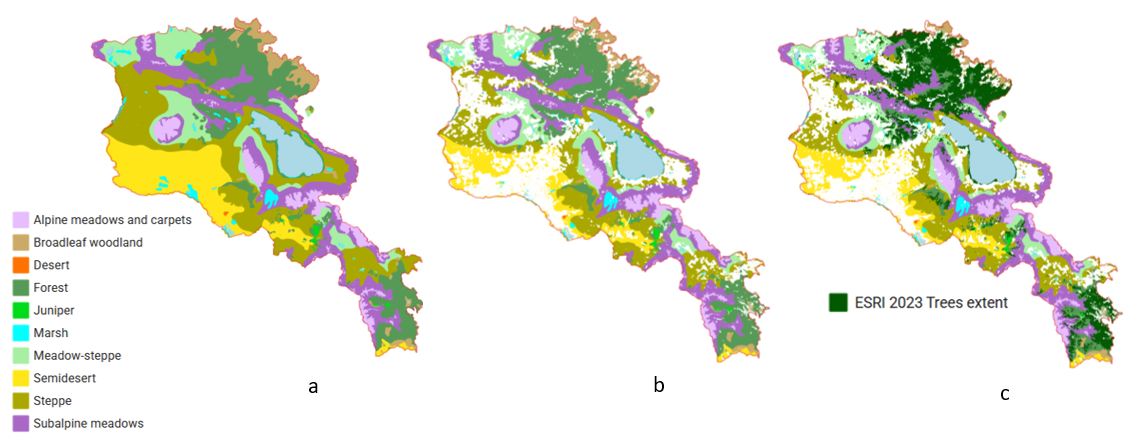 Figure 2.7B-1. Main steps to produce a map of current terrestrial ecosystems using ESRI data as an example: a) potential distribution of vegetation types; b) current natural area of vegetation zones excluding croplands and built-up areas; c) ecosystem types, including current tree cover For detailed map see project Web-GIS, sections Ecosystem Extent/Vegetation/Vegetation map 2025