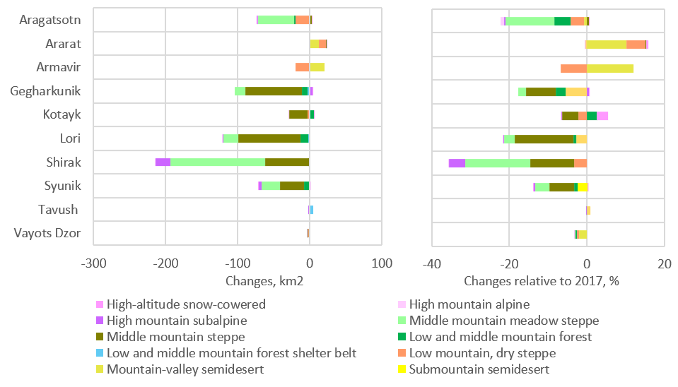 According to the ESRI land-cover data, the natural area of steppe and meadow-steppe landscapes decreased in all marzes except Vayots Dzor, Tavush, and Ararat (these landscape zones are absent in Armavir); subalpine landscape decreased in Shirak mars; low-mountain dry steppe – in Aragatsotn and Armavir marzes (Figure 24C-2). The only noticeable increases in the natural (non-cropland, non-built-up) area of landscape zones are the increase in mountain-valley semidesert area in the Ararat and Armavir marzes and in area of low mountain, dry steppe in Ararat, driven by a reduction in cropland in these marzes (see Section 2.2.B).