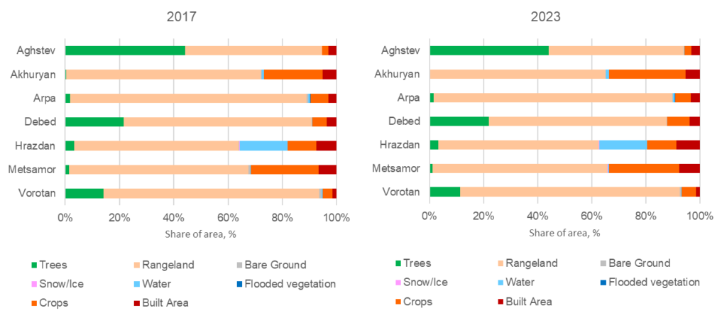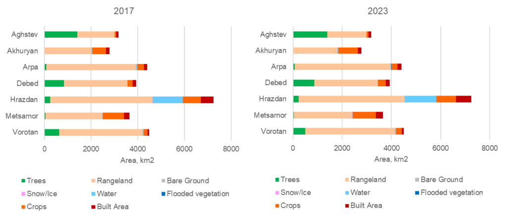Land cover class extent accounting was also carried out for the large watersheds, since one of the key purposes of ecosystem accounting is to assess water-regulating ecosystem services, which are modeled at the watershed level. Since in Armenia watershed boundaries largely coincide with marz boundaries (the Hrazdan, Metsamor, and Arpa watersheds each include two marzes), the pattern of land cover class area distribution and its changes from 2017 to 2023 mirrors the pattern identified at the marz level.
