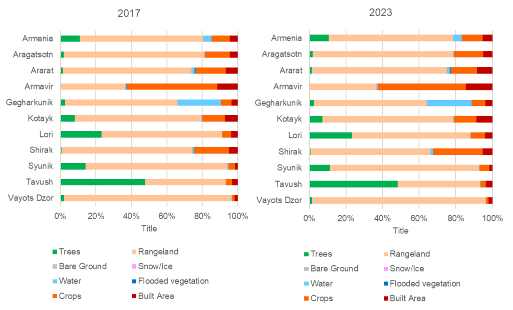 Figure 5. The share of area of land cover classes in Armenia and across marzes in 2017 and 2023, %