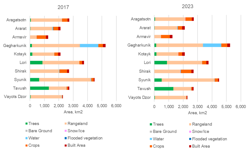 Figure 4. Area of land cover classes across marzes in 2017 and 2023, km2