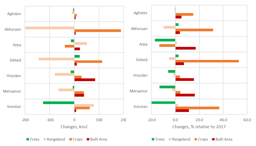 The most significant changes in land cover area occurred in Akhurian watershed (Shirak marz), where cropland area increased by 200 km² at the expense of grasslands. Similar but less extensive cropland expansion at the expense of grasslands took place in Debed watershed (Lori marz). In the Razdan and Metsamor watersheds, grassland areas decreased due to the expansion of croplands and built-up areas. Changes in the Arpa watershed are driven by changes in Ararat marz, where cropland area decreased due to the expansion of built-up areas and grasslands. In Vorotan watershed (Syunik marz), forest area noticeably declined due to an increase in grasslands and croplands.