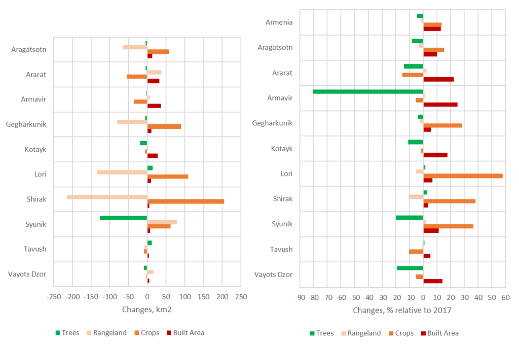 Figure 6. Absolute (km2) and relative (% of 2017 area) changes in area of the main land cover classes in Armenia and across marzes from 2017 to 2023