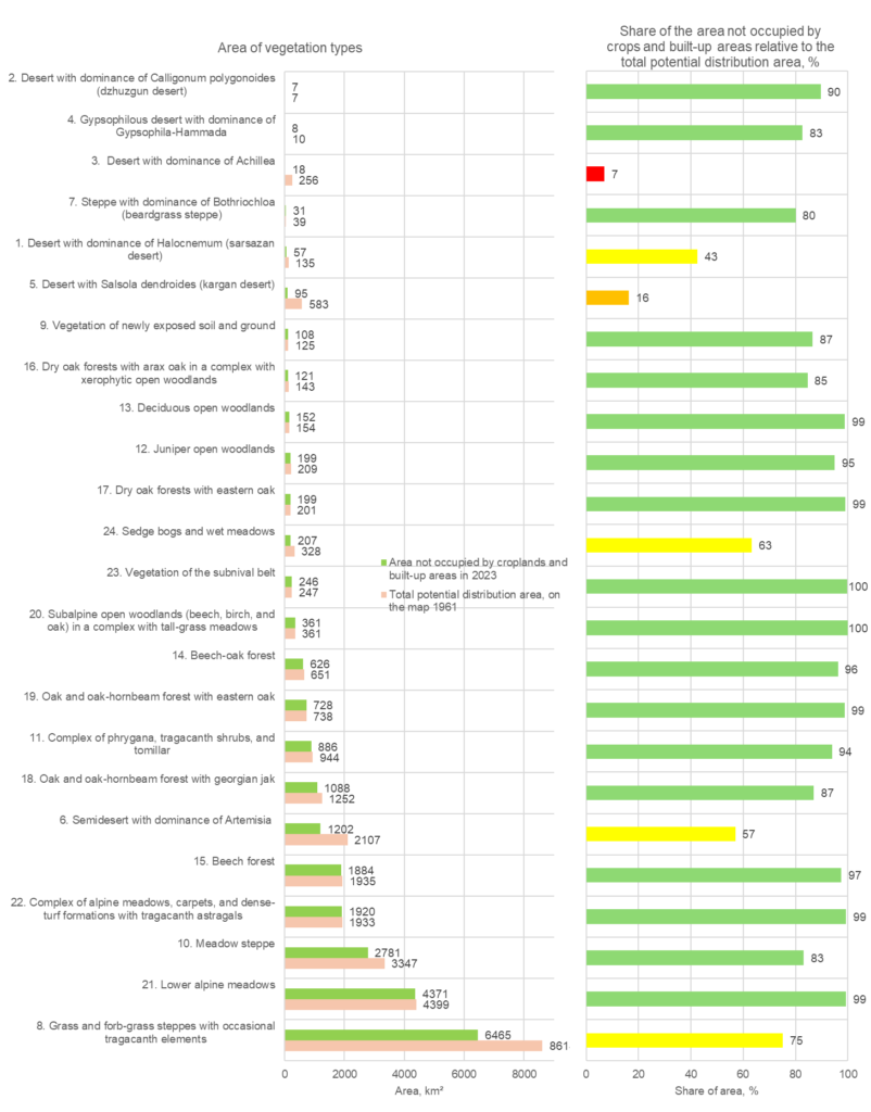 Among the more widespread vegetation types, occupying between 200 and 1,000 km², a significant reduction was observed only for sedge bogs and wet meadows (type 24), which declined to 63%. The distribution areas of other types — subnival vegetation, subalpine open woodlands, variants of oak and birch-oak forests, as well as shrublands — have been largely unaffected by human activity, with 94–100% of their area remaining intact.